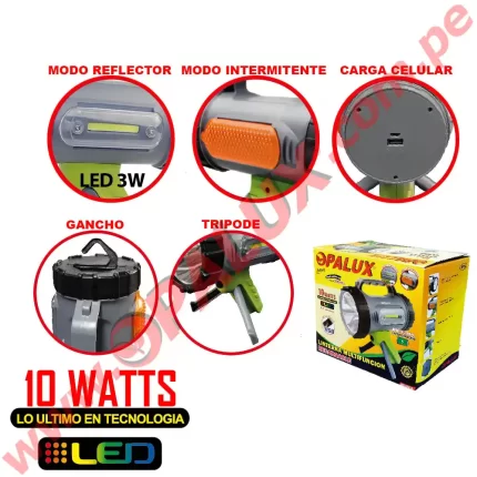 Linterna recargable LED 1W “Opalux” 50 MTS con lámpara de 10 led, 10 Hrs linterna 8hrs lámpara