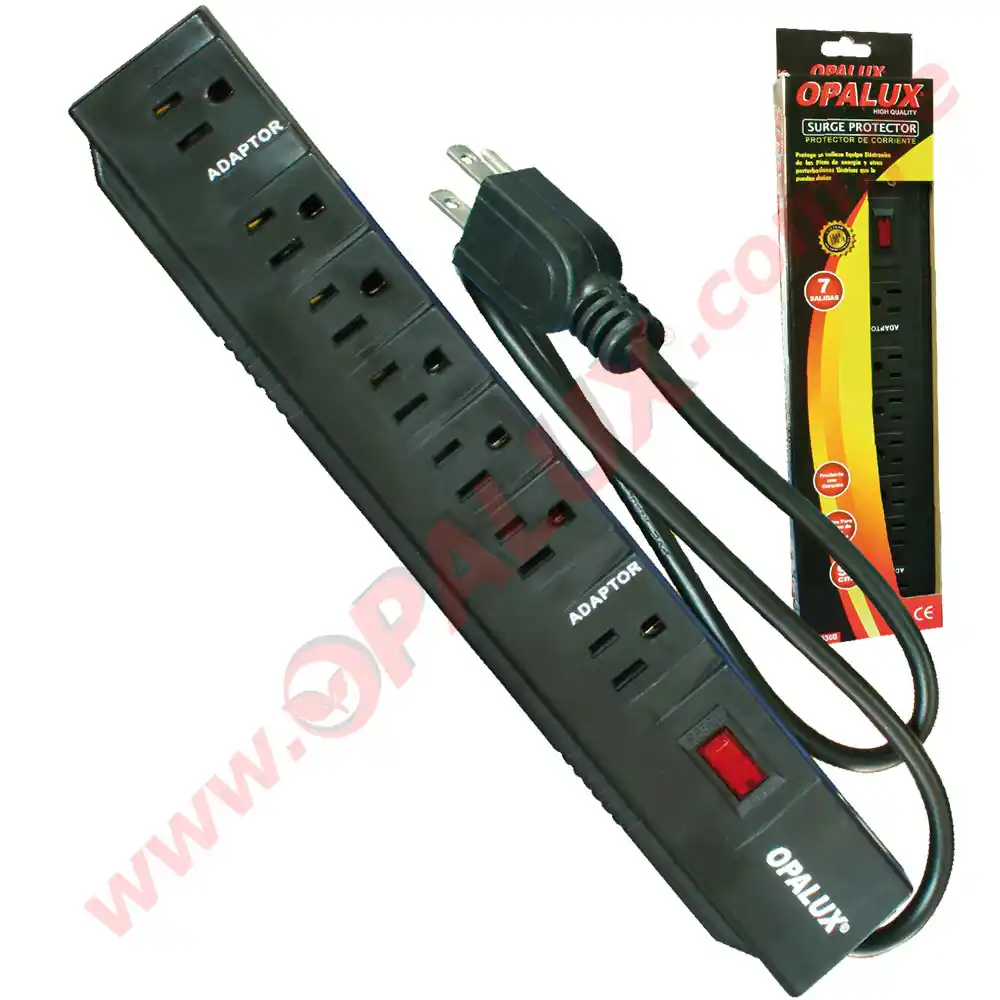 Supresor de pico 7 tomas trifasicas 10AMP con toma a tierra 1 switch ON/OFF cable 0.90mts 16AWG “OPALUX” color negro
