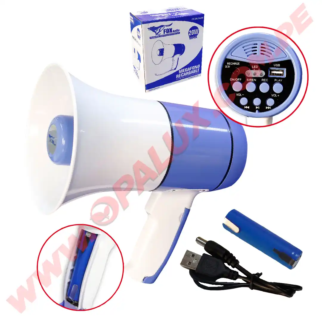 Megáfono de 20W “Fox Audio” micrófono, grabación, sirena, usb, mp3, batería lithium recargable