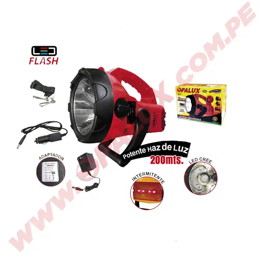 Linterna LED 10W “Opalux” 200MTS, LED CREE, 2.5 Hrs Alto Brillo, 60hrs luz intermitente, recargable, cargador de auto, batería 4V 6Ah color rojo