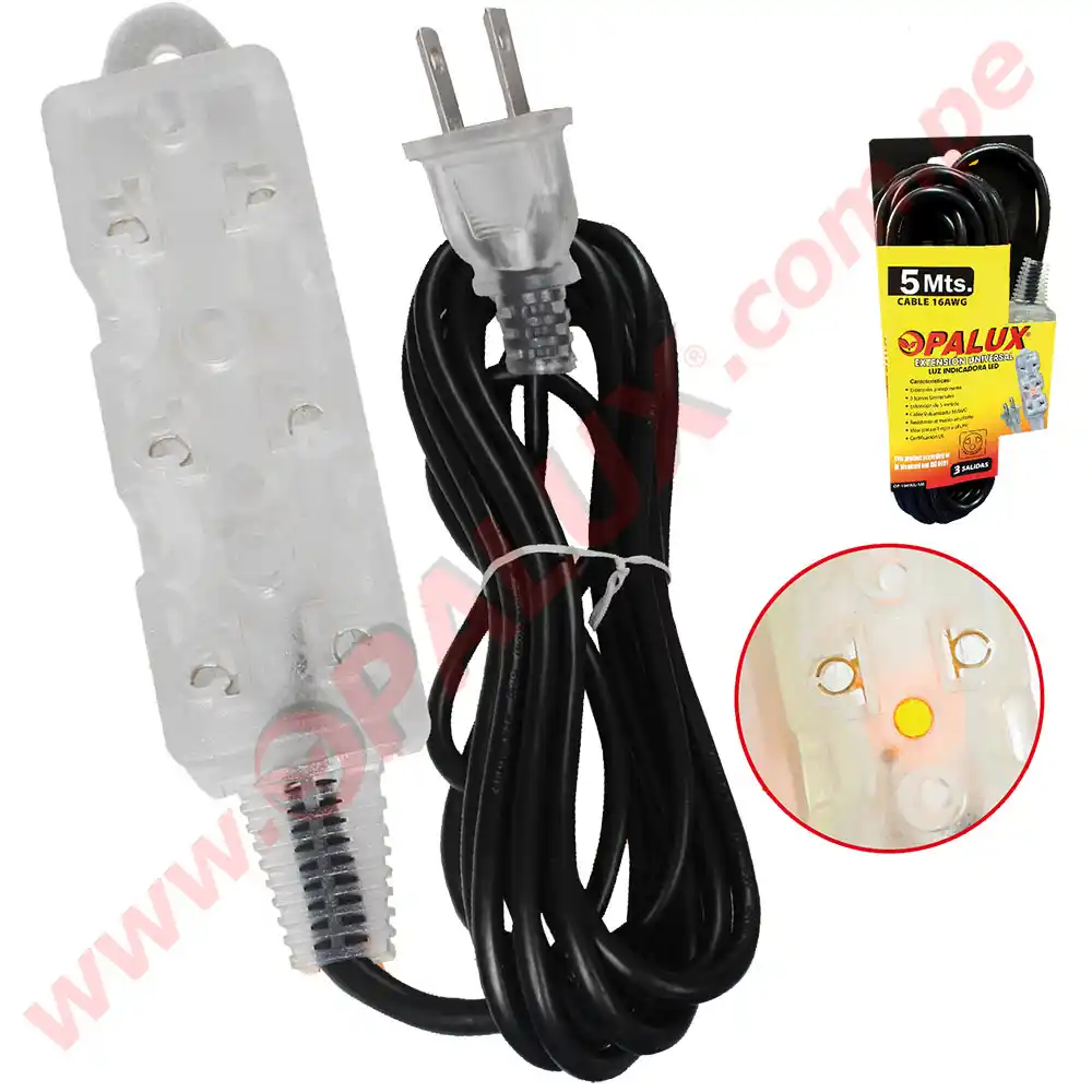 Extensión eléctrica 5mts «Opalux» con 3 de tomacorrientes certificado UL transparente