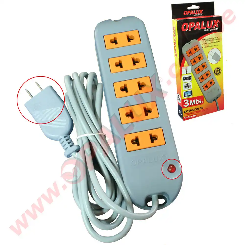Extensión eléctrica 3mts «Opalux» con 5 de tomacorrientes color gris y naranja