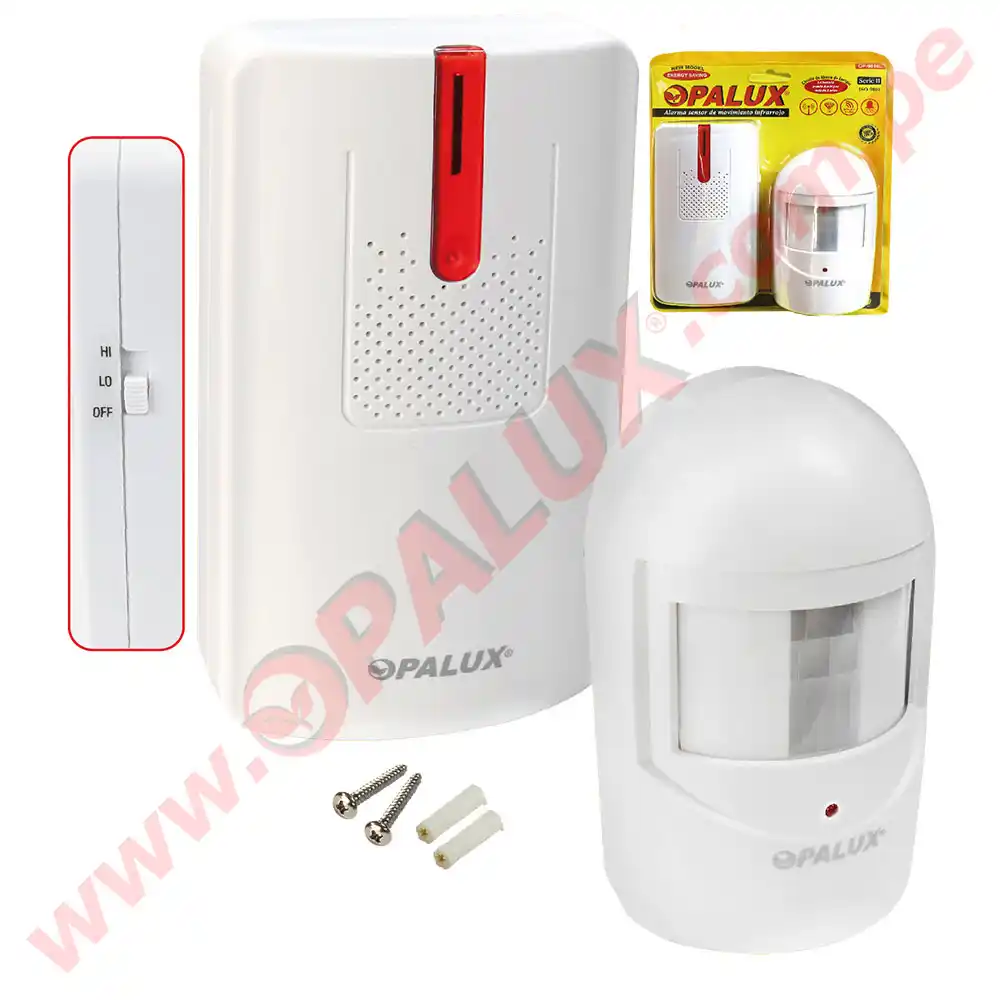 LED indicador de funcionamiento, Bateria 9V, Angulo de detección 75º, Indicador de baja voltage: <6.1V+-0.1V, Retardo de detección: 6seg., Medidas 11×6.5×4.7 cms Receptor: Switch ON-OFF / Volumen HI-LO, usa 3 Pilas AA (4.5V DC), Máx. Vol> 100dB, Indicador de baja voltage: <3.3V, Medidas: 13x7x2.5cms.