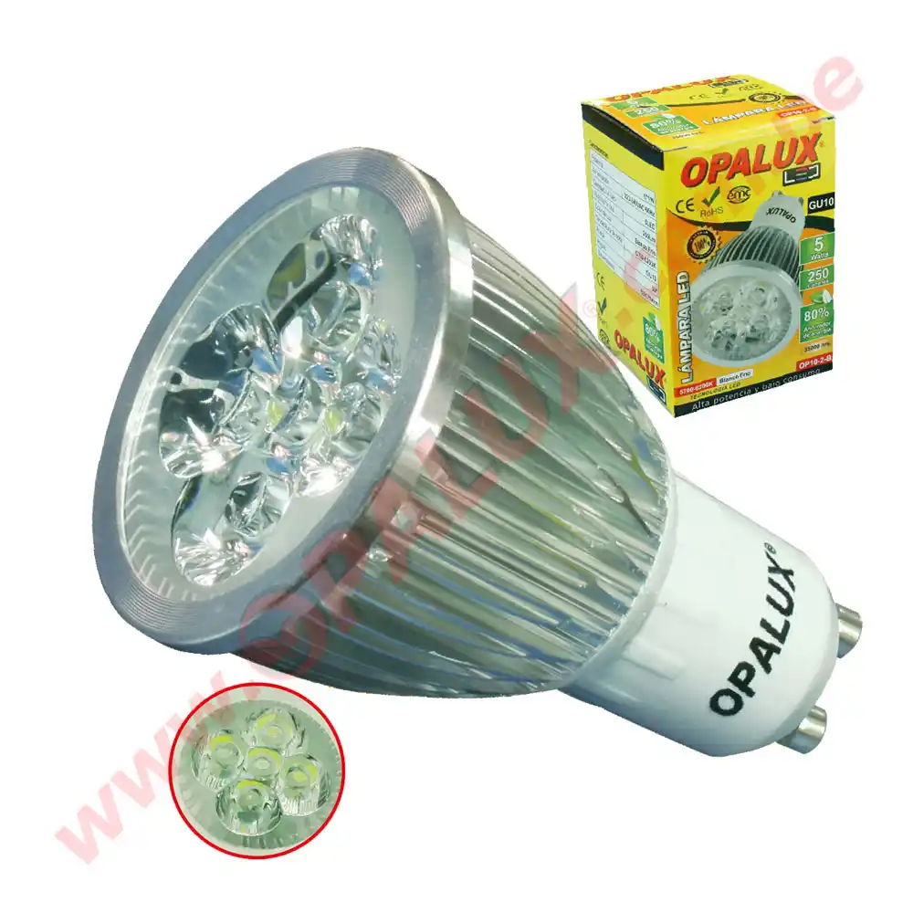 Dicroico led 5W «Opalux» Luz Blanca 5700-6200K 220v conector GU10 250 lumens 35,000hrs decorativo