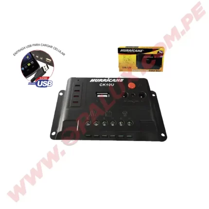Controlador de carga solar 10AMP PWM marca “Hurricane” 12v/24v con 1 salida USB