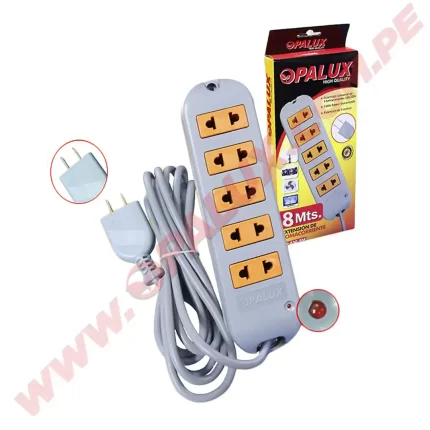 Extensión eléctrica 8mts «Opalux» con 5 de tomacorrientes color gris y naranja