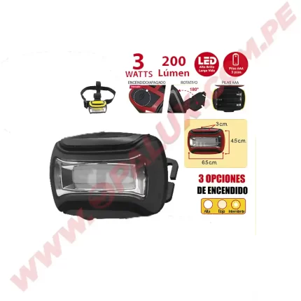 Linterna de cabeza o casco a pilas LED 3W “Opalux” 20MTS 3 tiempos color negro