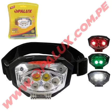 Linterna de cabeza o casco a pilas LED 5W “Opalux” 40MTS 3 tipos de Iluminacion blanca roja y verde