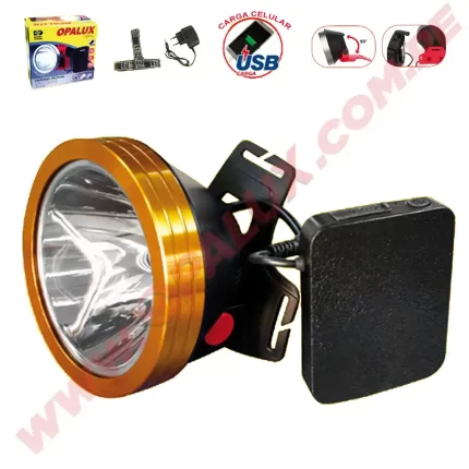 Linterna de cabeza o casco recargable 7W power “Opalux” 150MTS USB 2 tiempos 10hrs y 35hrs color negro dorado